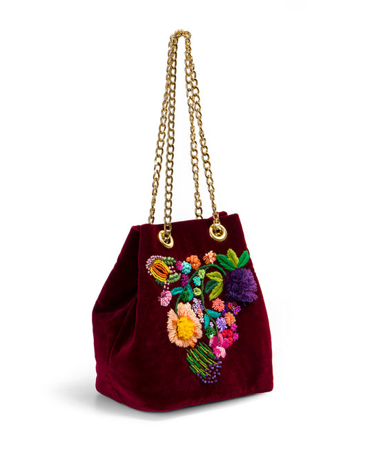 Flores Bordadas a Mano Sobre Terciopelo Vinotinto