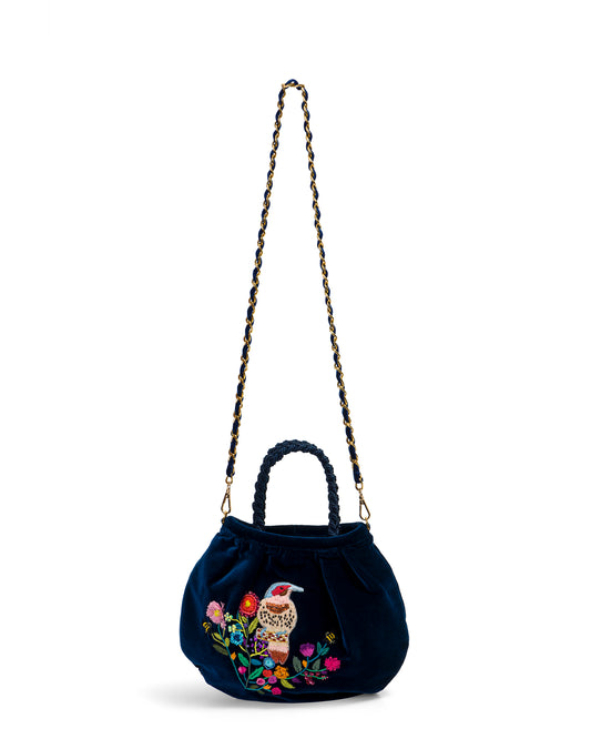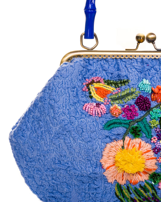 Pájaro y Flores Bordados a Mano, en Azul Atardecer