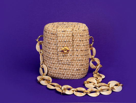 Bolso Baúl Tweed Fondo Habano con Cadena Acrílica