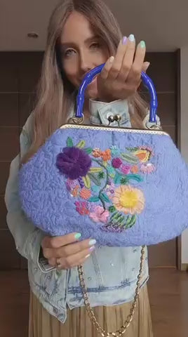 De estilo vintage, moderno y atemporal, este bolso ha sido hecho a mano en Colombia, con un exclusivo paño italiano en color azul hortensia, de edición limitada.